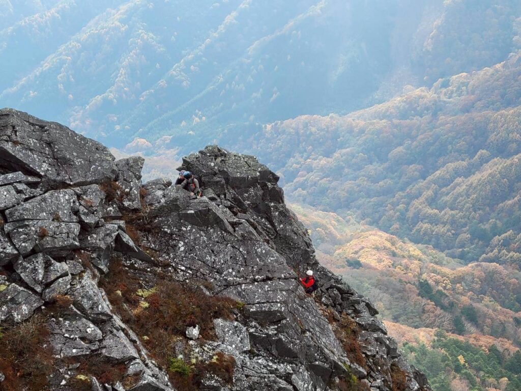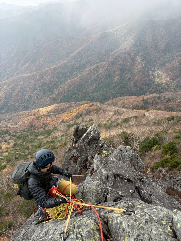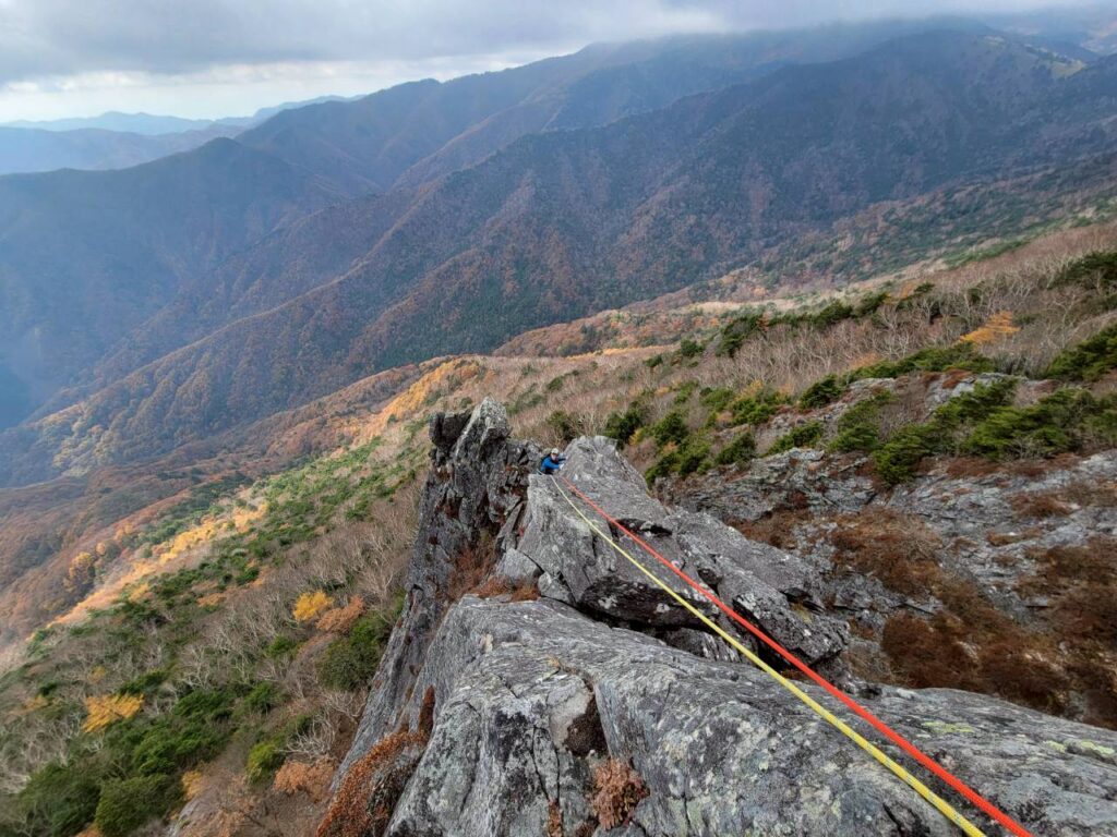 顕著な馬の背状のリッジ歩きですので、スリング等での中間支点は取らず、ロープをリッジ上に縫うように掛けることで中間支点としました。