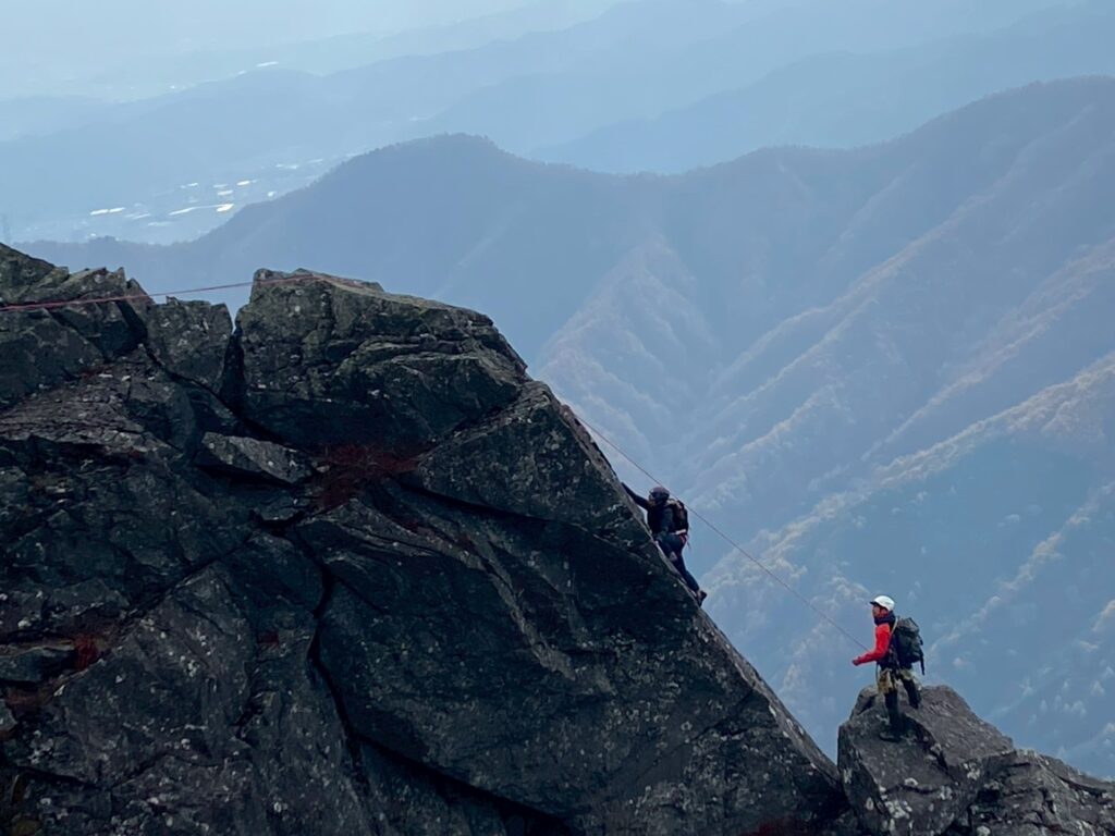 引っ掛からないように、ロープの半分は投げて、もう半分はテラスで待機するメンバーから送り出してもらう形で下降しました。