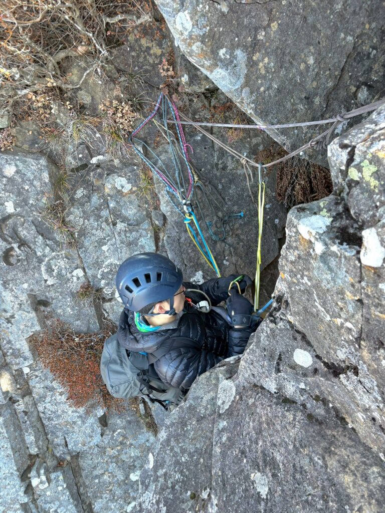 とはいえ、アプローチの浮石パラダイス、リーダーの私I澤が特大落石を落としたこと、クライミング中の寒さ、岩の脆さ・浮いている、残置支点がハーケンのみ、屈曲してロープが信じられないくらい重くなるなど、アルパインクライミングの難しさを改めて思い知らされました。