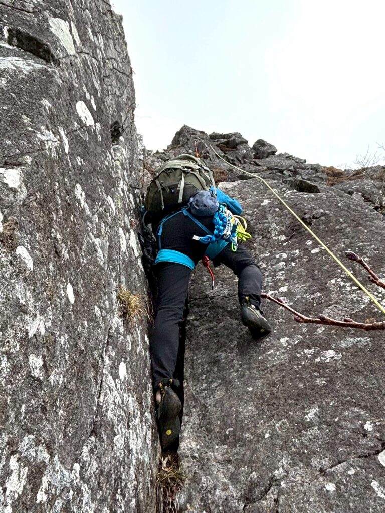 2&3ピッチ目は2ピッチ目出だしの凹角と、3ピッチ目最後のフェイスが若干のクライミングムーブになりますが、ホールド・スタンス共にしっかりあって、クライミングシューズであれば問題なく登れると思います。