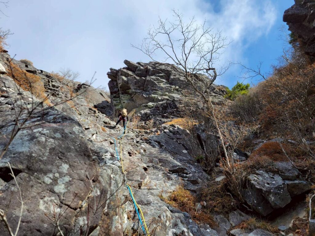 ➁パーティ。H島さんが岩にスリングを回して作ったビレイポイントにO滝さんが到着。A木さんがフォローしている所。