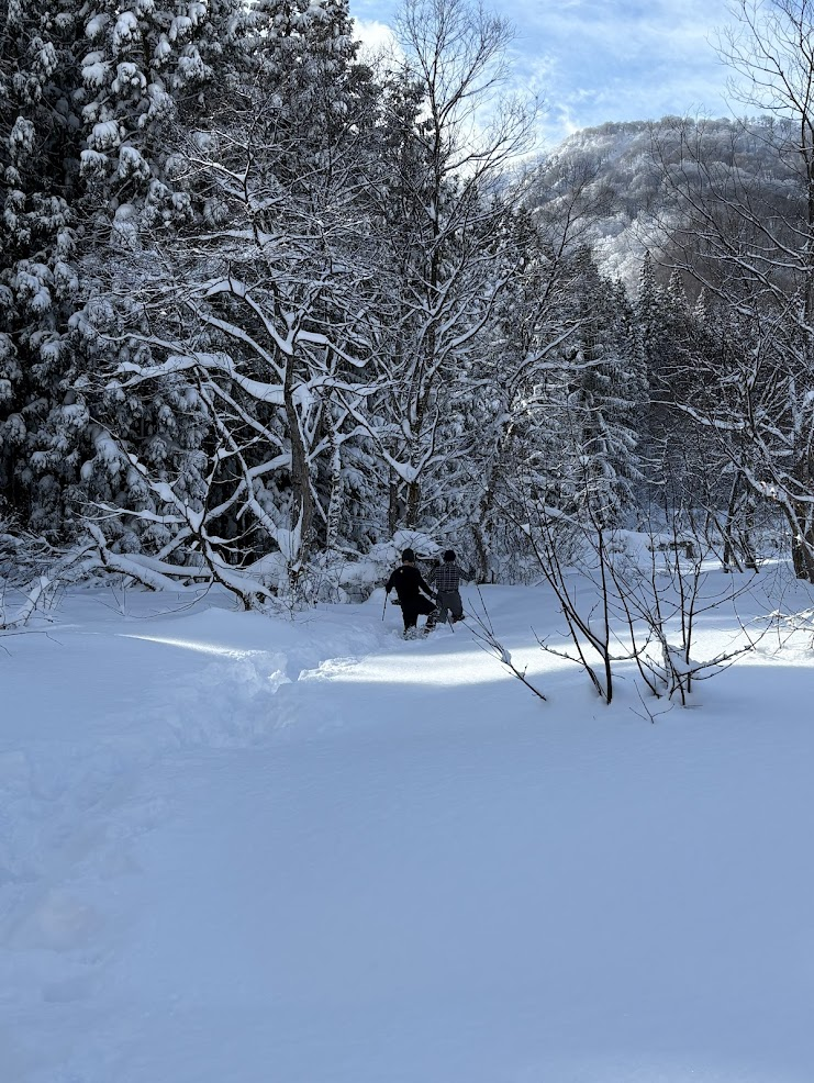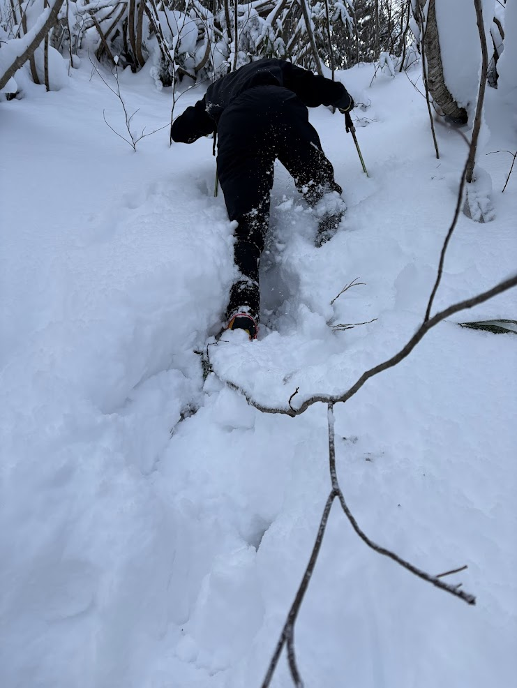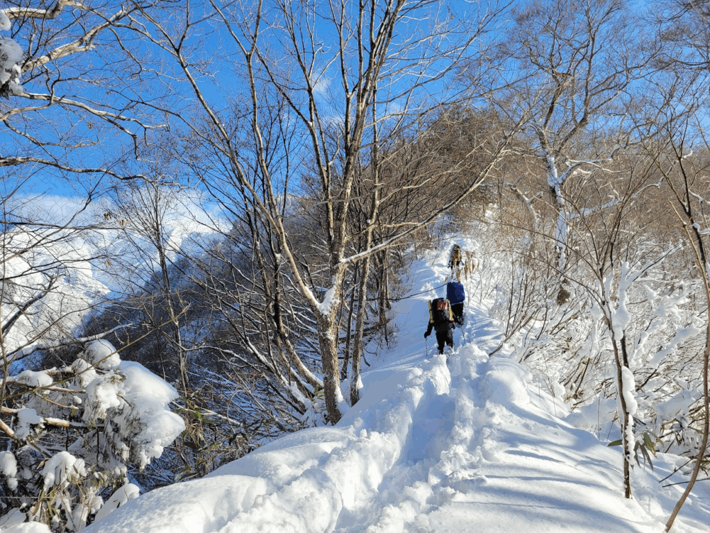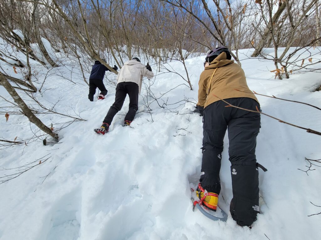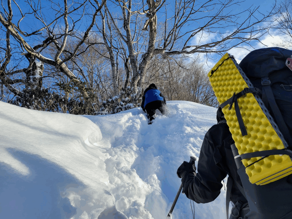 1日目と違い、尾根は細くなり、樹木の上を縫うように歩くラッセルが続きます。変なところを歩くと雪を崩して滑落してしまいそうな気がしてルーファイに悩み、先輩方にアドバイスをいただきながら進みました。
