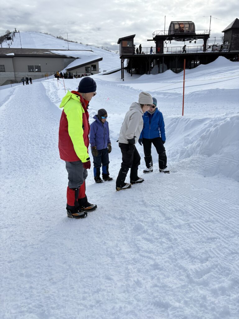 N山さんが除雪終了地点の様子を伺い、スタートからもうワカン装着することが決定。