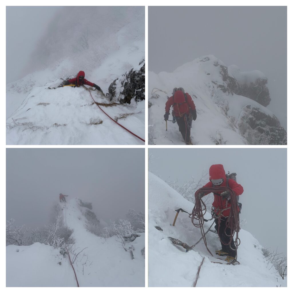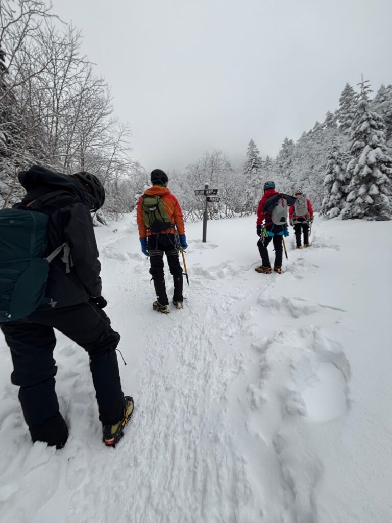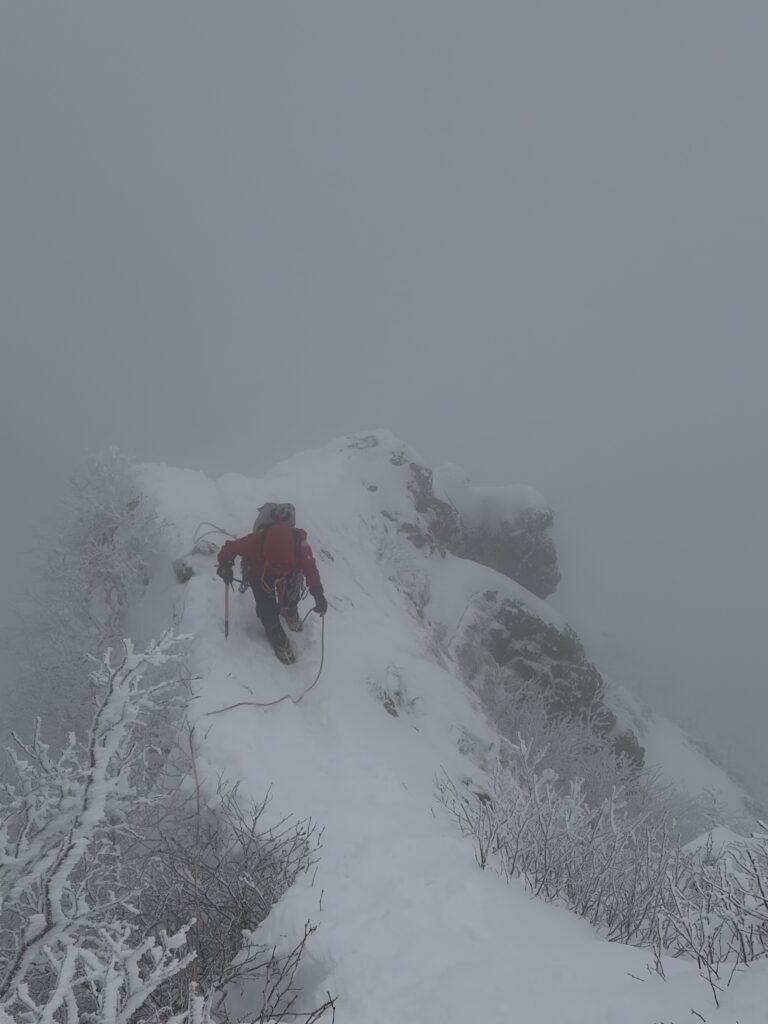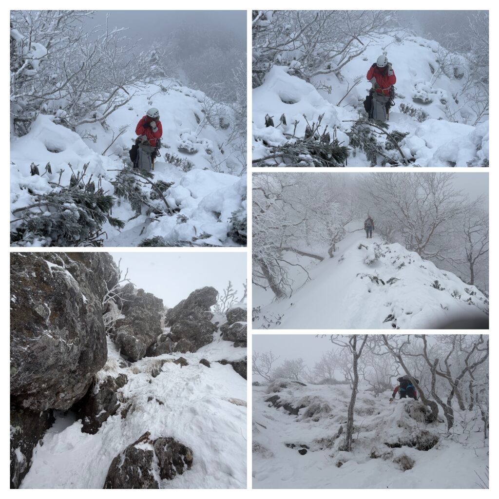 記念撮影をして下山を開始します。細尾根は岩や木の根が出ておりワカンでは危険な箇所もあったため、安全のため途中でピッケルとアイゼンにチェンジして下山しました。