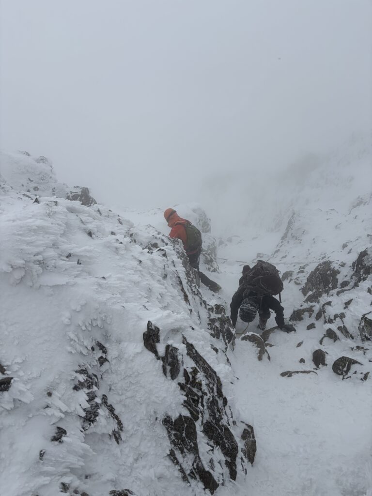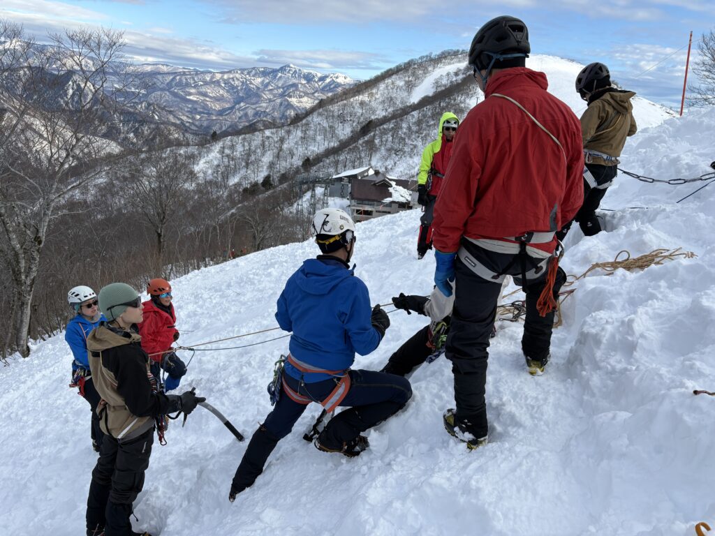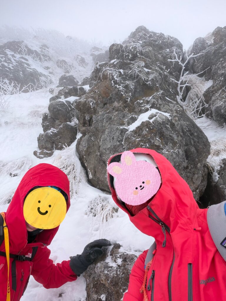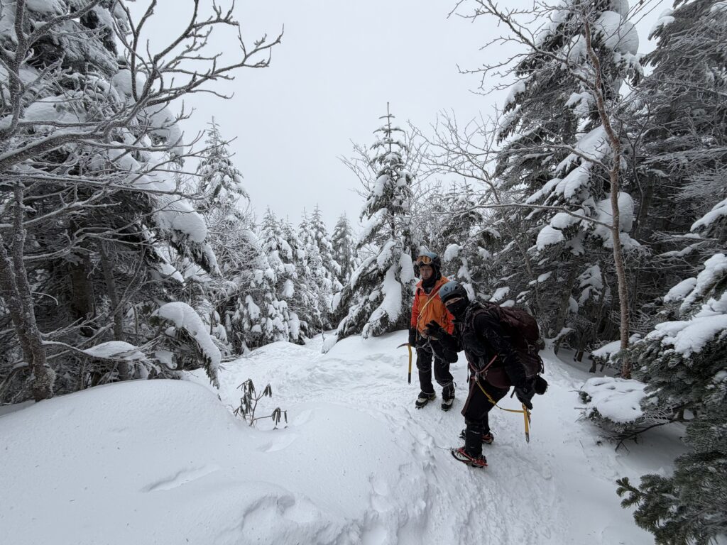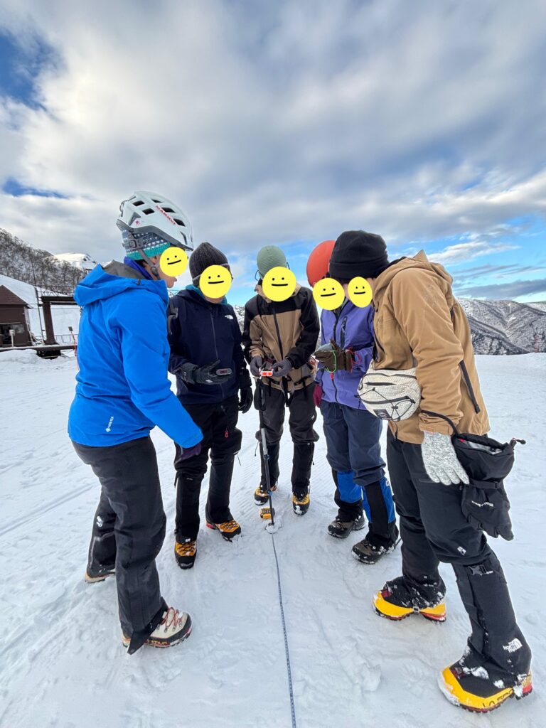 記念撮影をして下山を開始します。細尾根は岩や木の根が出ておりワカンでは危険な箇所もあったため、安全のため途中でピッケルとアイゼンにチェンジして下山しました。