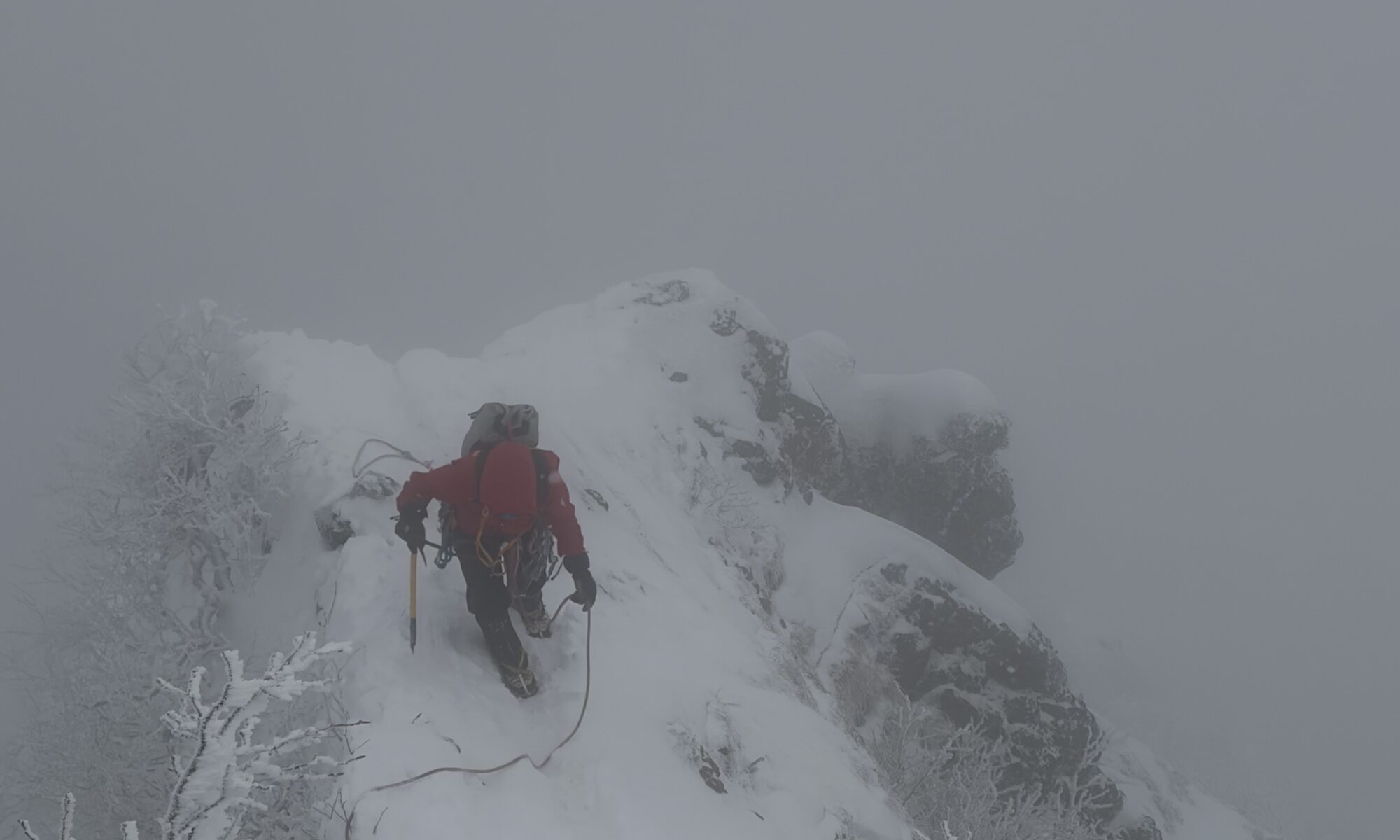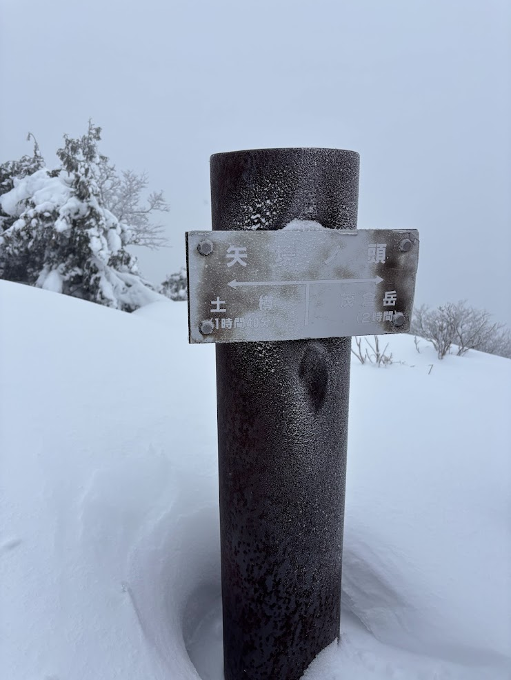 予報では高気圧が張り出してきてそろそろ晴れる時間帯だと思っておりましたが、回復が遅れているようで視界はあまりなく。それでもうっすらと矢場の頭らしきピークが見えました。