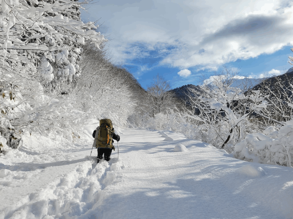 真っ白な道をひたすらラッセル、進んでも進んでもラッセル、とにかくラッセル。ラッセルしてザックを回収に戻り、ザック分重くなった体でまた来た道を戻る……。