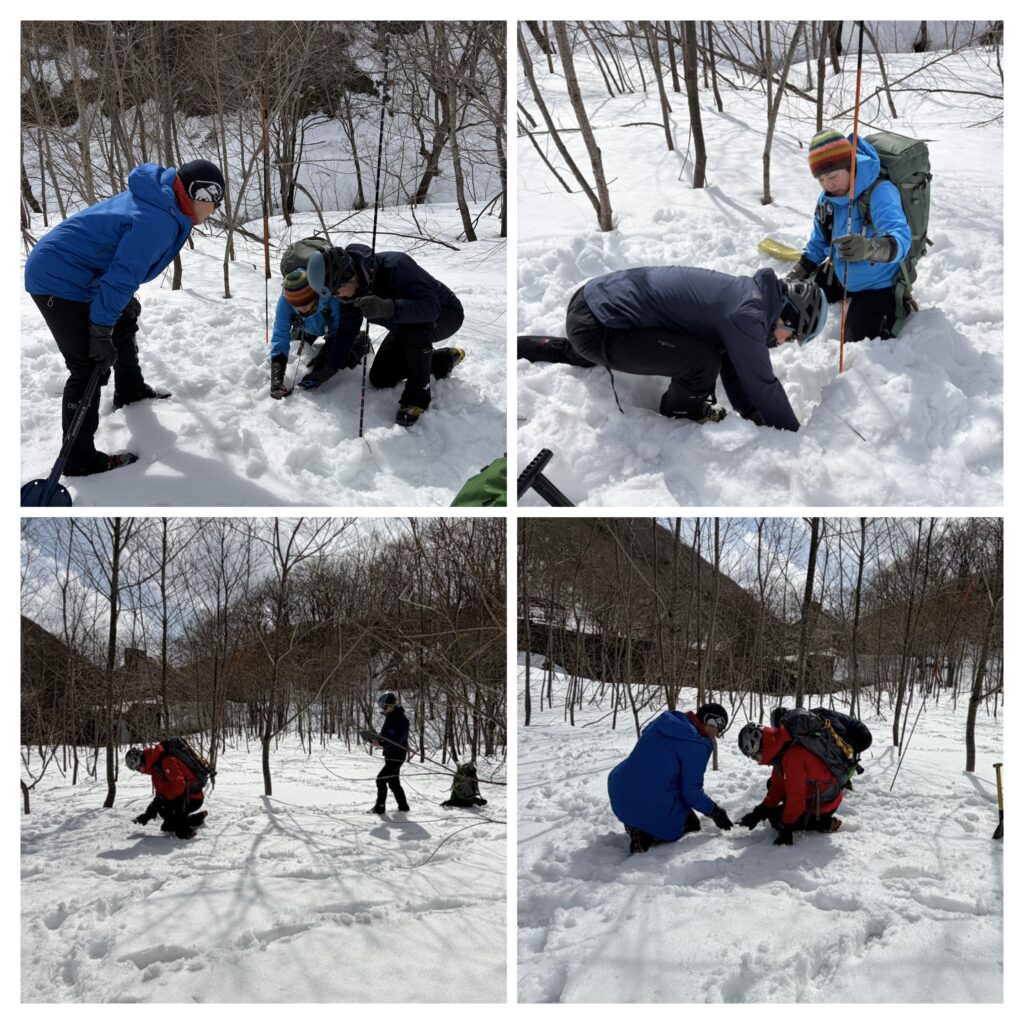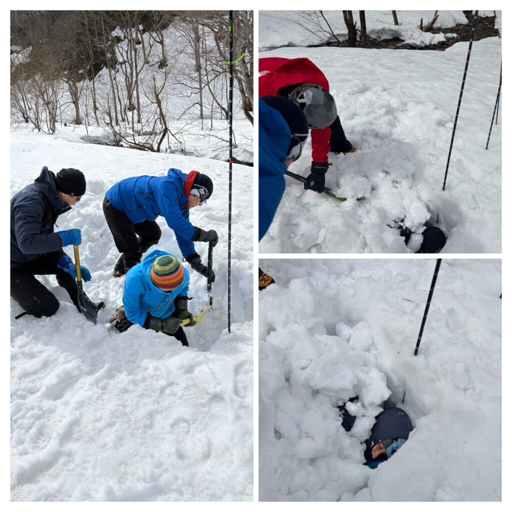 ビーコンを使って要救助者の埋没場所の特定から、掘り起こし救助までの一連の動作を全員で実施。今回は平坦な場所での訓練でしたので、場所の特定まで移動は容易に出来ましたが、雪崩によるデブリや木々や岩などの障害物をかき分けながら捜索となると、捜索者の安全も確保しながらの作業が必要になります。