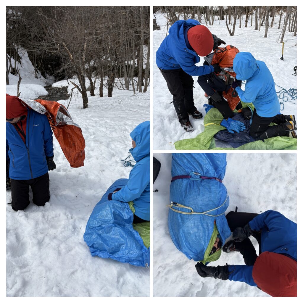 T橋さんより、ハードシェルなどアウターを着た状態からエマージェンシーシートを使って身体を包む方法と、さらにツェルト、ブルーシートで身体を包みスリングを使って搬送可能な状態の作り方を指導頂きました。